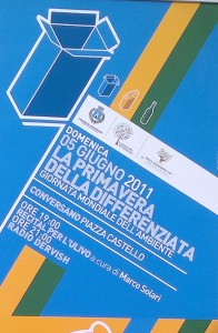 La performance ha dato corpo e voce al tema della festa, La primavera della differenziata, un argomento che ormai è diventato una priorità nei comportamenti e nelle pratiche, e che in Italia ancora stenta ad imporsi, sia per carenza troppo spesso delle istituzioni, sia per la trascuratezza e disinformazione dei cittadini. Del resto se i cittadini non hanno né informazione né strutture non possiamo riversare su di loro (noi) la responsabilità di un malgoverno di questo fondamentale aspetto della vita.